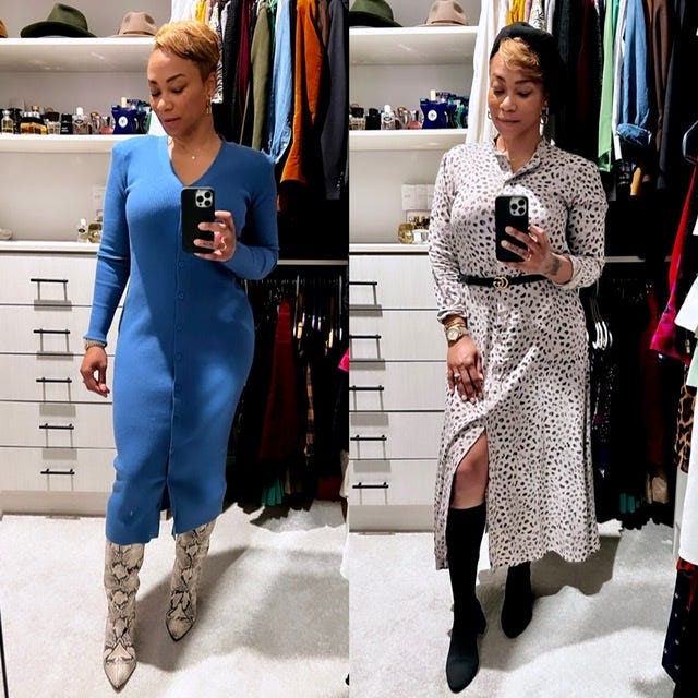 Last but not least, the fifth item is the dress. I'm sure you have several dresses, and you're thinking, but in winter? Yes! Dresses are essential in winter because they save you the headache and time of using multiple pieces to pull together a look. When you don't have time to stand in the closet figuring it out, you wake up late, or it's the weekend and you want an elevated look, a dress is a go-to. Long, short, with/without tights, a sock boot, or knee-high boots, it's an easy look to pull together.