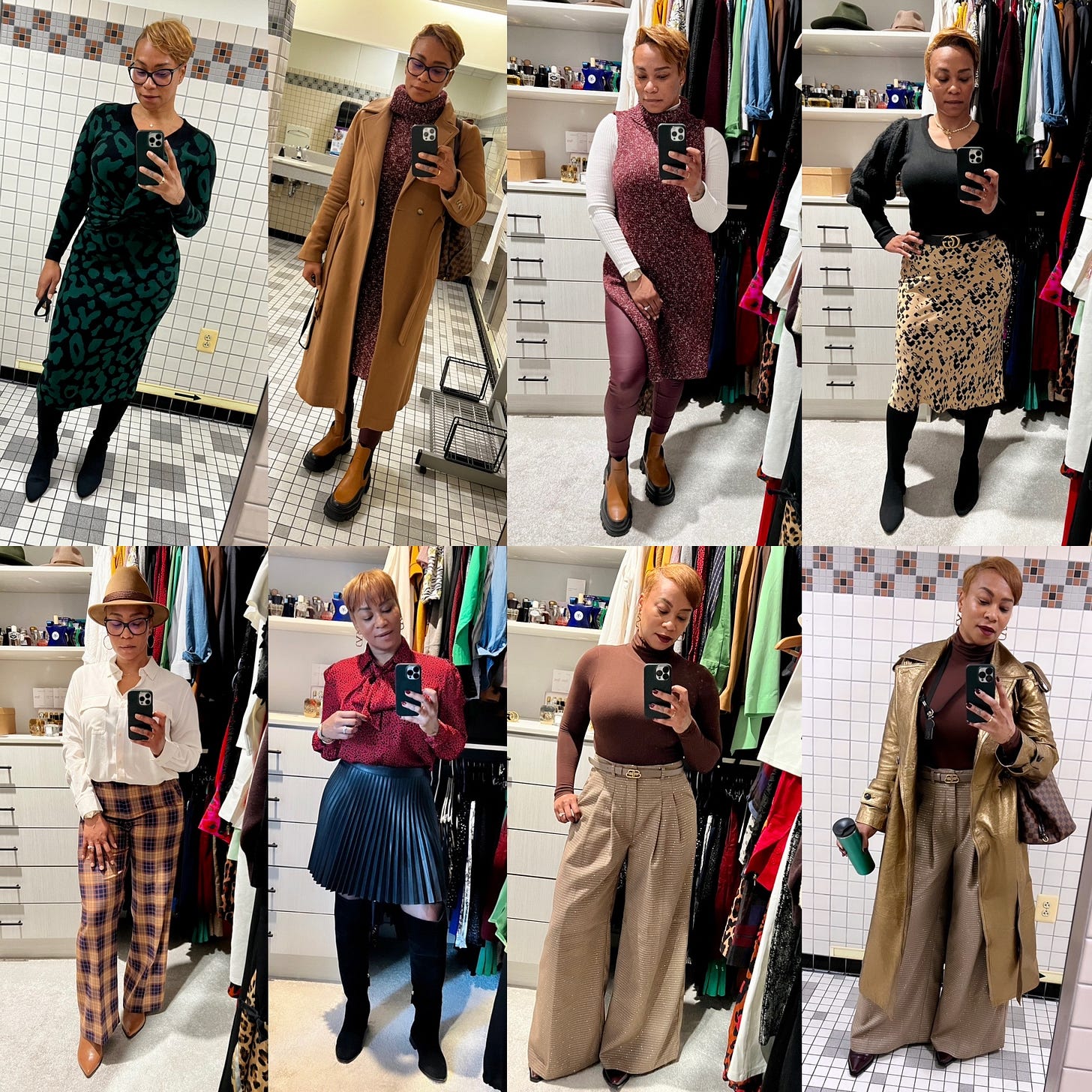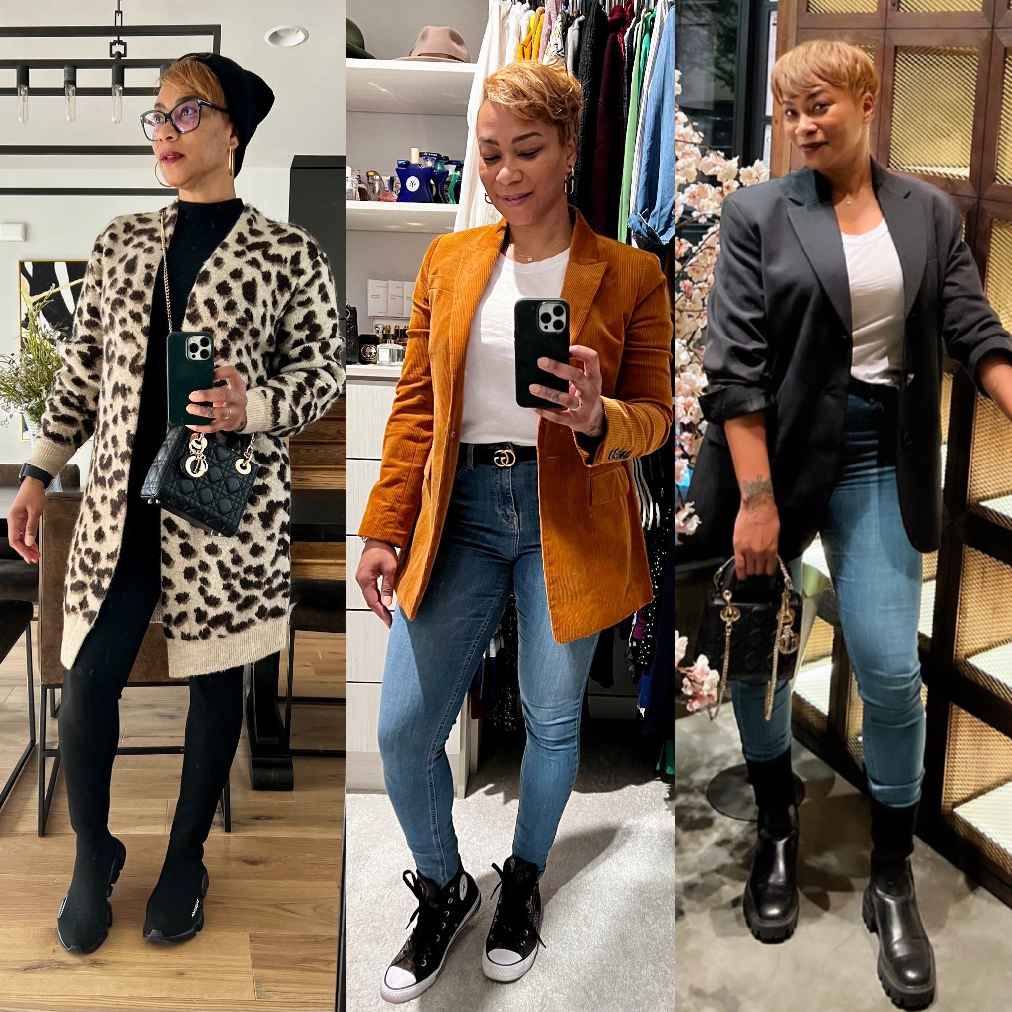 Let's talk about elevating your look outside work, out and about, or running errands. I know it's easy to throw on leggings, a hoodie, and some UGGs because I do it all the time 😂 but I attempt to elevate the look a bit. Pictured below is my "I'm home teleworking, but I need to run to my doctor's appointment at 9 am look" next to my favorite style muse Tracee Ellis Ross 😍, Katie Holmes, and Rihanna in similar street style. There is nothing fabulous about either of these looks, but it takes that one item to elevate a look; in this case, I think it's the coat, but in others, it can be the statement piece of jewelry, the hat, adding a pop of color to your nails and/or lip, or the bag (I carried my LV mini backpack, so the chocolate matched my boot 😉). I felt good, comfortable, and cute, and if I ran into a photographer from Getty's Image and they snapped my picture for a Vogue street image series, I would NOT have been mad. I'm just saying! Tracee and Rihanna are always stylish to me, even in their relaxed wear (we will dive more into my thoughts or their style later).
